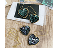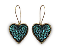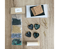 Este Kit de bordado incluye todo lo necesario para realizar 2 pares de aritos de Corazón en Pedrería; un par morado y un par verde.