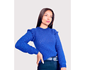 Inspirado en el mar, los vuelos en los hombros y la textura del sweater representan el movimiento y las olas del mar, de ahí su nombre Navy.