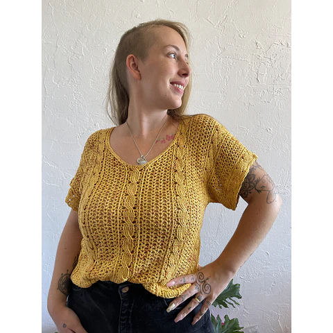 Si quieres relajarte tejiendo un diseño entretenido, pero que no requiera estar concentrada en cada fila, este diseño es ideal para ser tu proyecto de vacaciones: El Top Shanti tiene una construcción sencilla, tejemos el delantero y la espalda en plano, para luego unir ambos paneles con aguja lanera. Las mangas se tejen junto al cuerpo, por ende son solo 2 piezas completas.